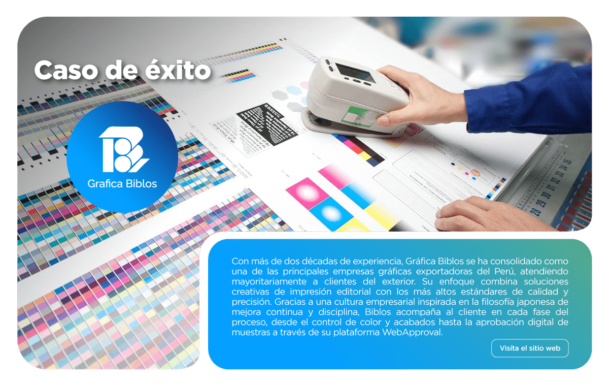 Con más de dos décadas de experiencia, Gráfica Biblos se ha consolidado como una de las principales empresas gráficas exportadoras del Perú, atendiendo mayoritariamente a clientes del exterior. Su enfoque combina soluciones creativas de impresión editorial con los más altos estándares de calidad y precisión. Gracias a una cultura empresarial inspirada en la filosofía japonesa de mejora continua y disciplina, Biblos acompaña al cliente en cada fase del proceso, desde el control de color y acabados hasta la aprobación digital de muestras a través de su plataforma WebApproval.